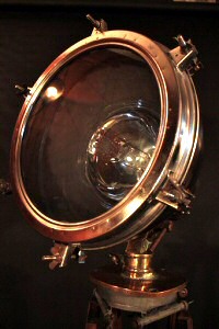 Très beau modèle de phare de pont de bateau, vers 1930 monté sur trépied de géomètre, cuivre et fonte de laiton, pied réglable, chêne massif.