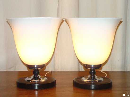 Lampes à poser vers 1930, modèle archétypique Art Déco, chrome, verrerie opale, socle façon acajou.