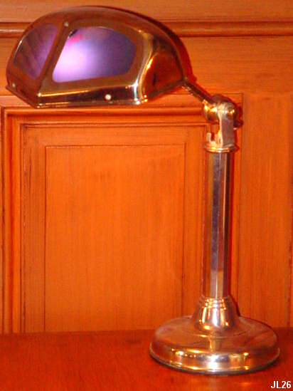 Lampe de bureau, grand format, travail français vers 1930 avec bras télescopique, 2 positions, pied chrome, réflecteur en verre bleu.
