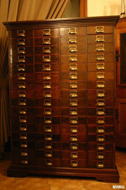 Meuble de métier, vers 1910, façade noyer, 64 tiroirs, très belle facture, "poignées porte étiquettes" en laiton.